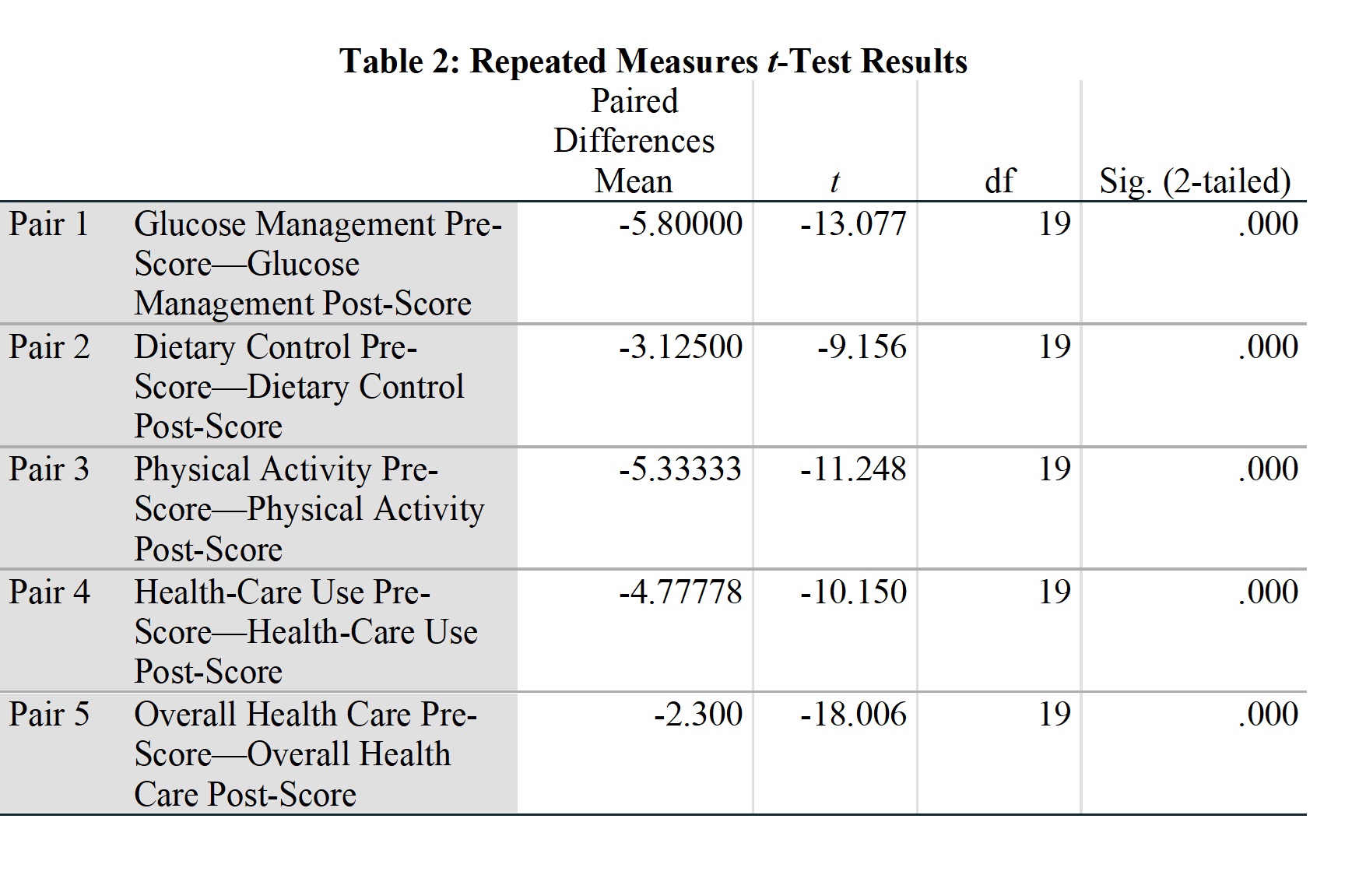 The primary research question explored in this study was, “For adult patients with Type 2 diabetes at Patient's Choice Primary Care Associates Clinic, does the implementation of the CDC guidelines for self-care management through the use of mobile devices improve scores on the diabetes self-management questionnaire, compared to current practice in 8–10 weeks?” Given that the study collected pre- and post-intervention data for a single group of participants, a repeated measures t-test was the appropriate data analysis technique. Repeated measures t-tests were run on the four subscales and the overall summary score for the DSMQ. Table 2 presents the repeated measures t-tests were run on the four subscales and the overall summary score for the DSMQ.